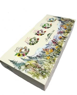 Hutsulski Tereveni (general strengthening tea). Ingredients: Nettle herbs, Wild Chamomile herbs, Thyme herbs, Saint-John’s-wort herbs, and Mint herbs, blackthorn. It is recommended for general weakness, decreasing immunity, intestinal diseases and for improvement of the general state of the organism. The tea has a general strengthening effect.