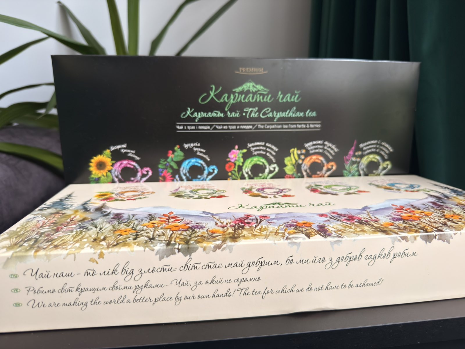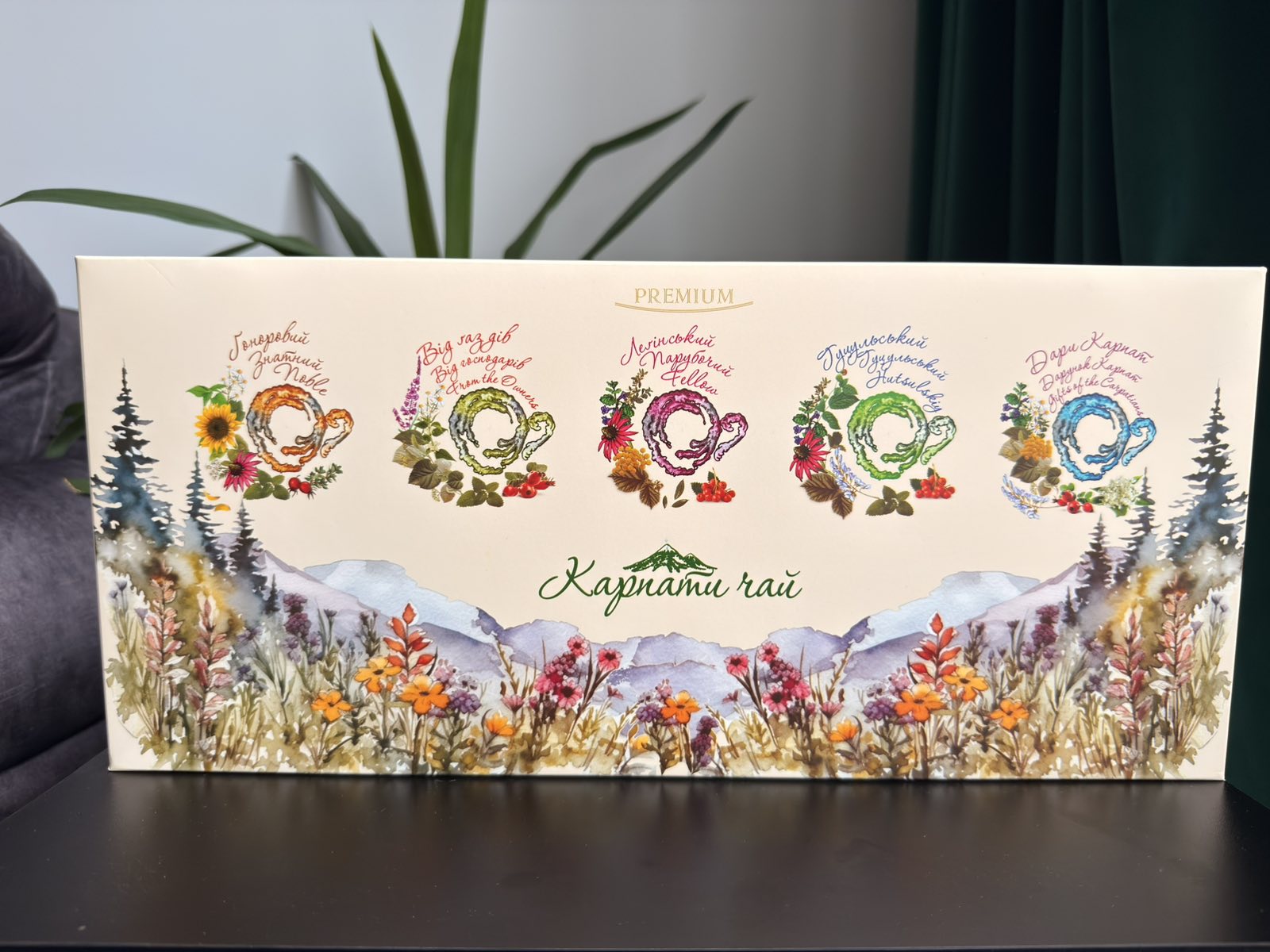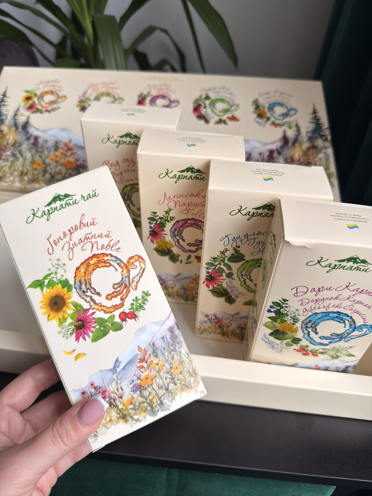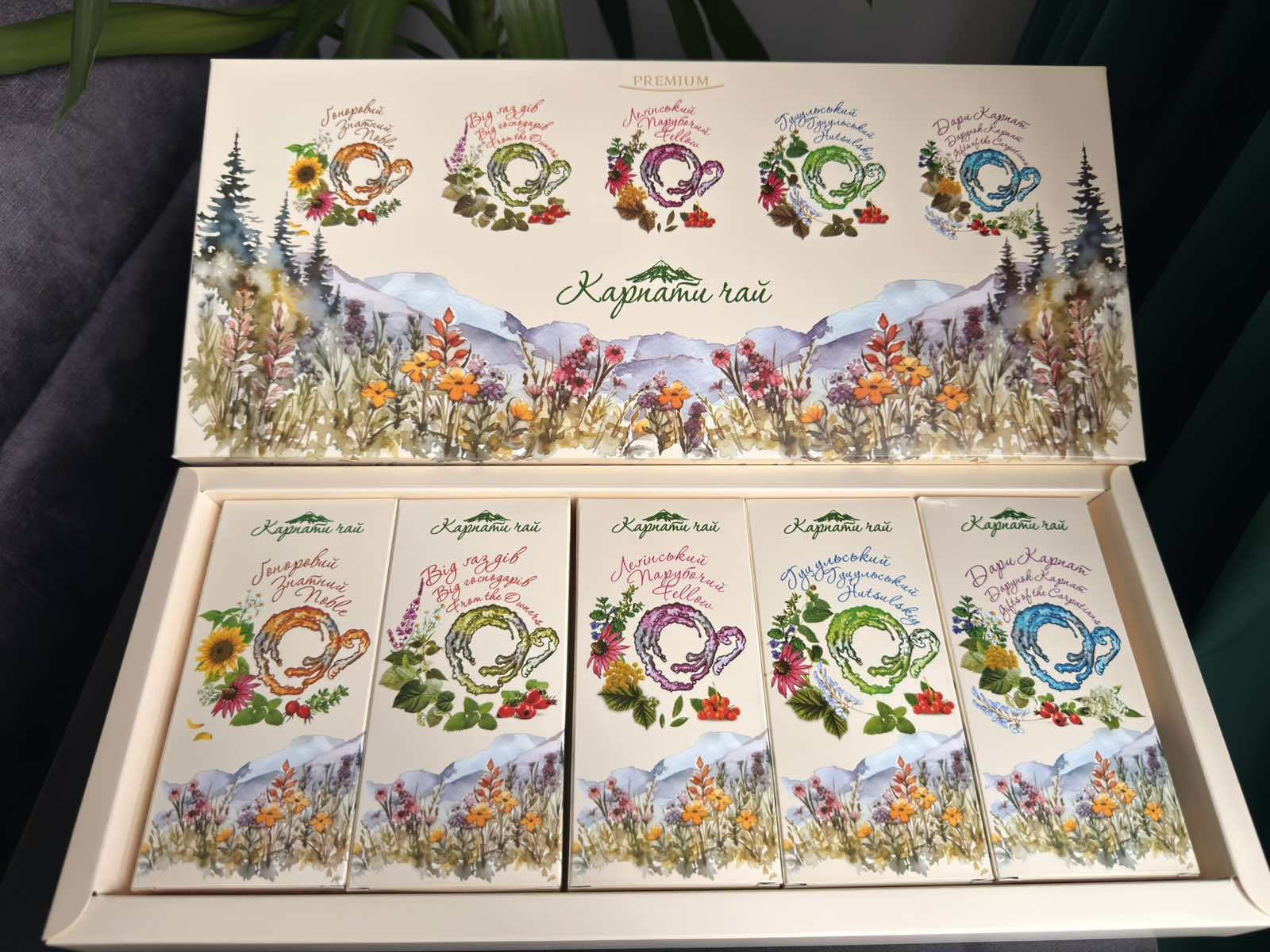 Gifts of the Carpathians (vitamin tea). Ingredients: Lingonberry leaves, raspberry leaves, Immortelle flower heads, elderberry flower heads, Wild Chamomile flower heads and herbs, Calendula flower heads and herbs, linden-tree flowers and leaves, fruits of black elderberry. It is recommended for general drowsiness, exhaustion, vitamin deficiency, depression and rehabilitation of the organism forces. The tea has the effect of rehabilitation treatment.